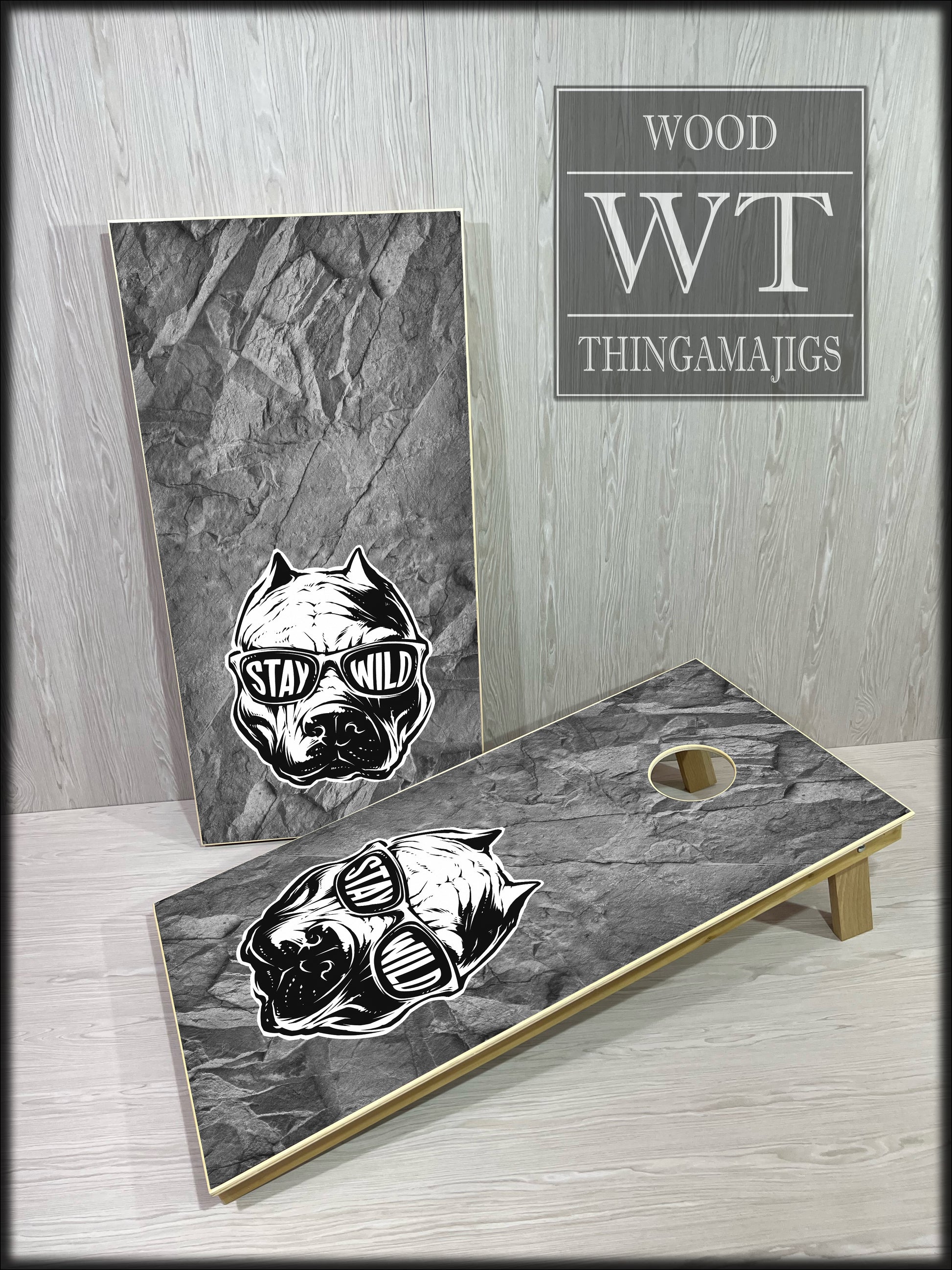 Solid red oak frames and legs with cabinet grade tops (Baltic Birch tops available). No weak plywood frames here! All frames include four cross braces to eliminate bounce. We print our skins in-house so the sky is the limit on designs. All of our cornhole sets meet or exceed ACL regulations! All corners are rounded to prevent bag tears. Other companies claim to have boards strong enough to park a truck on - we proved it!