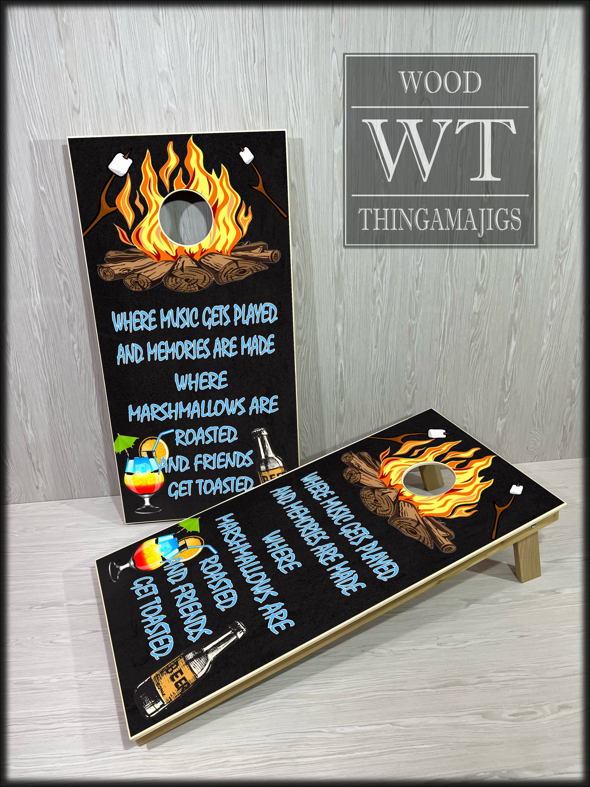 Solid red oak frames and legs with cabinet grade tops (Baltic Birch tops available). No weak plywood frames here! All frames include four cross braces to eliminate bounce. We print our skins in-house so the sky is the limit on designs. All of our cornhole sets meet or exceed ACL regulations! All corners are rounded to prevent bag tears. Other companies claim to have boards strong enough to park a truck on - we proved it!