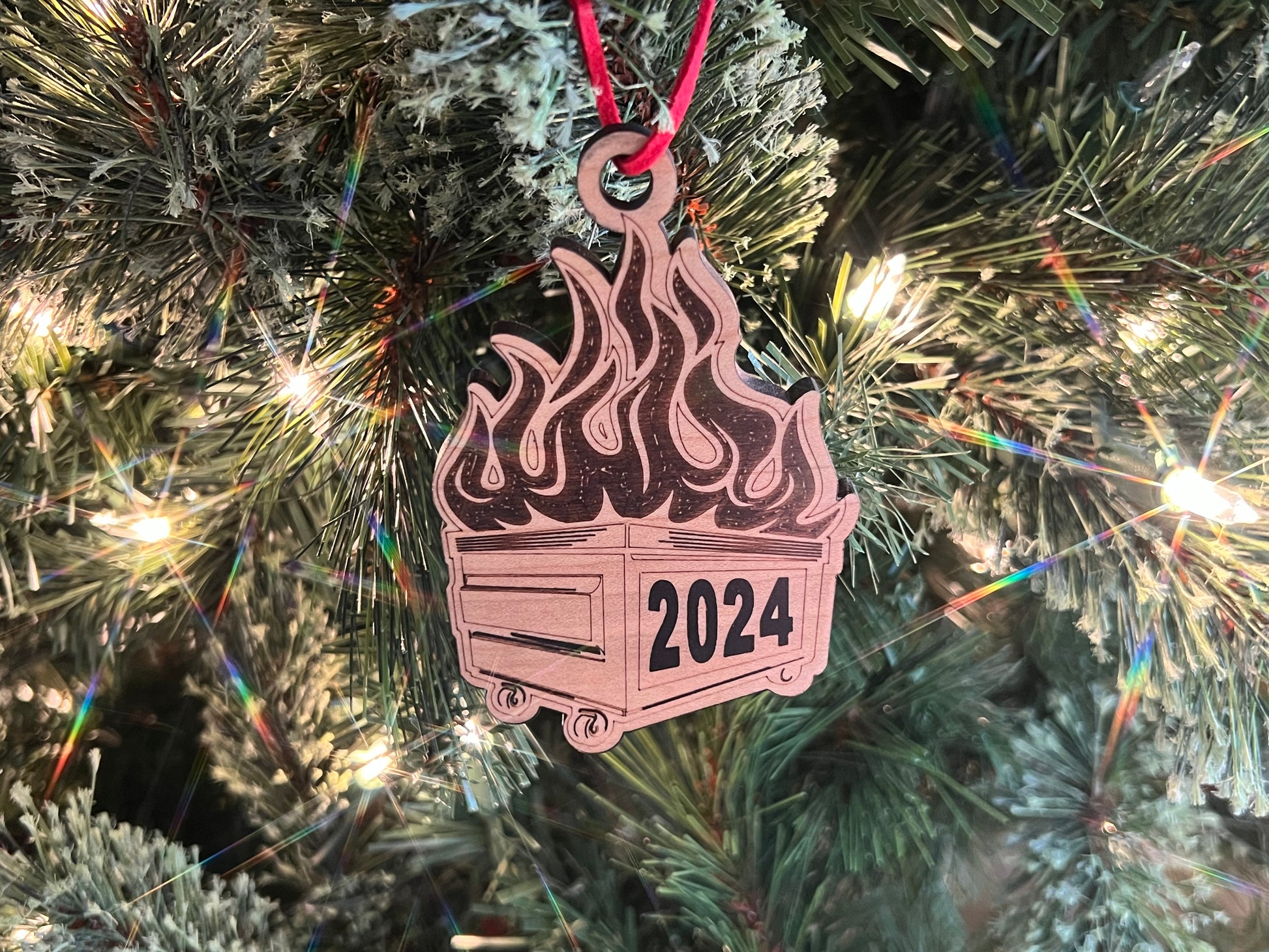 Bring a touch of wit and charm to your holiday décor with our unique "2024 Dumpster Fire Ornament." Crafted from high-quality wood, this whimsical ornament showcases a stylized dumpster with playful flames, perfectly embodying the ups and downs of the year!